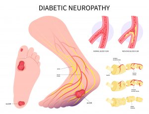 Diabetic Neuropathy can cause insensitivity or a loss of ability to feel pain, heat, and cold. Diabetics suffering from neuropathy can develop minor cuts, scrapes, blisters, or pressure sores that they may not be aware of due to the insensitivity. If these minor injuries are left untreated, complications may result and lead to ulceration and possibly even amputation. Neuropathy can also cause deformities such as Bunions, Hammer Toes, and Charcot Feet.